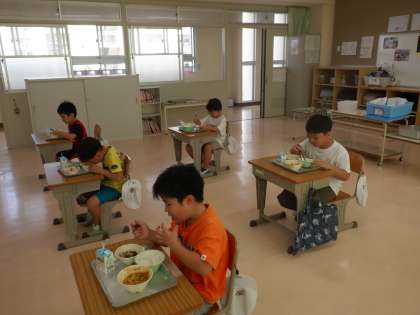 今日の献立は、ご飯、カレーうどん、和風サラダ、牛乳です。ひじきが入ったサラダもしっかり食べます!