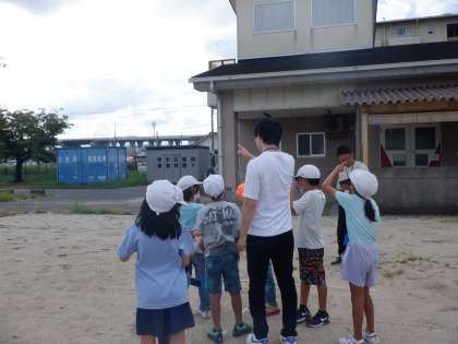 「影はどんなところにできるのかな?」普段の生活から知っていることを話し合い、影と太陽の位置を観察しました。