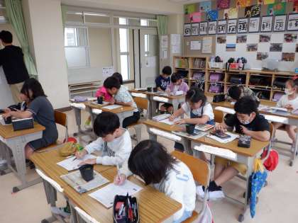 ホウセンカとヒマワリの芽の観察をしました。大きさや形、色に着目して、よく見てワークシートに気付いたことを書きました。