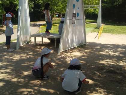 いつのまにか、鬼ごっこが始まりまっています。木陰で少し休憩中の人もいます。