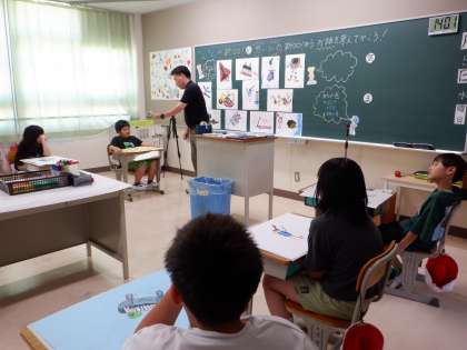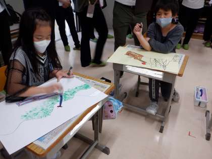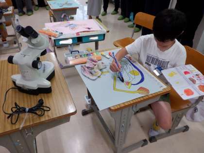 「思いついた新〇〇からお話を考えて描こう!」をテーマに、見立てたものの続きや周りの様子を描きました。堺市の他の学校の先生がたくさん来られていましたが、みんなが楽しく集中して取り組んでいる姿をほめてくださっていましたよ。よく頑張りました。