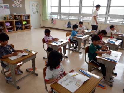 「のこりは いくつ ちがいは いくつ」の学習で、絵を見て、ブロックを動かして、式にしました。ひき算の学習が始まりました。
