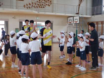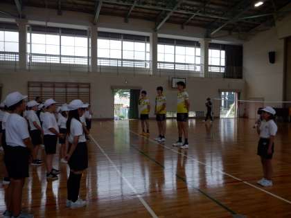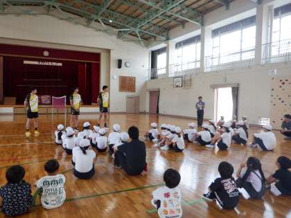 プロバレーボールチーム・堺ブレイザーズから、江藤選手、鵜野選手、竹元選手をお招きして、バレーボールの出前授業を行いました。選手の姿が見えると、「おおー」と歓声があがりました。