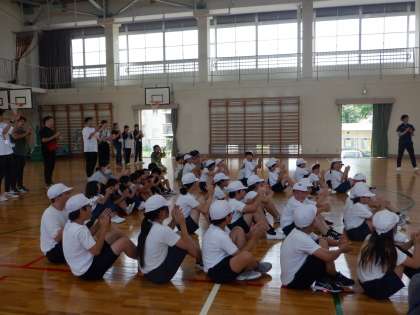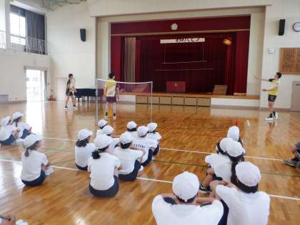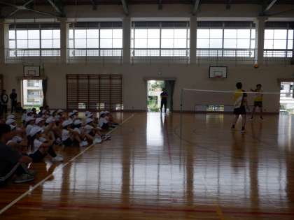 はじめに、デモストレーションを見せていただきました。力のあるスパイクでも、「今で50%の力くらい」という言葉を聞き、「ええー」とびっくりしていました。100%のスパイクは、すごい迫力がありましたね。
