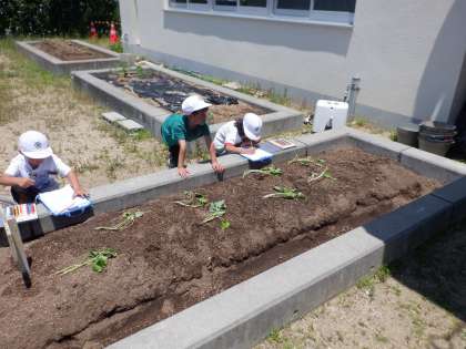 サツマイモの苗を植え、観察しました。いいお天気すぎるので、途中から風吹き広場でワークシートを書きました。