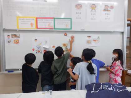 1〜4年生 食育の授業2 公開日 2024/06/18 更新日 2024/06/18 学校紹介 朝ごはんの献立を見て、どんなメニューを足せばバランスがよくなるのか、考えました。最後には、いろいろな質問をしました。「みんなも苦手なものがあっても、そのうち食べられるようになるよ」と言ってくれました。朝ごはんは元気に1日過ごすためにとても大切です。赤・黄・緑の食材をバランスよく食べるようにしましょう!