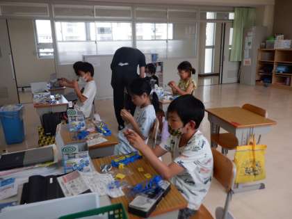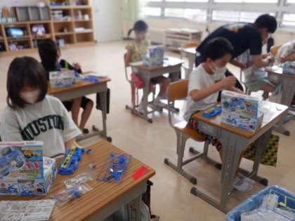 「電気のはたらき」で使った実験機器で、モーターカーを組み立てました。うまく走るでしょうか。楽しみですね。