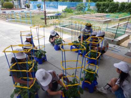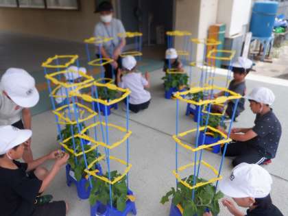 アサガオの植木鉢に支柱を立てました。伸びているつるを支柱に優しく巻き付けました。