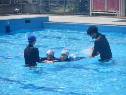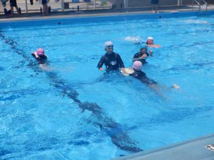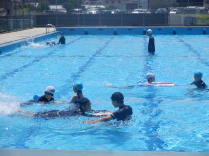 4・5・6年生 学校水泳3 公開日 2024/06/21 更新日 2024/06/21 学校紹介 ヘルパーをつけたり、ビート板を使ったりして練習しました。チームの中で得意な人がビート板を引っぱって、「足は伸ばすんやで」などとアドバイスをしていました。バタ足にもずいぶんと慣れてきた様子でした。