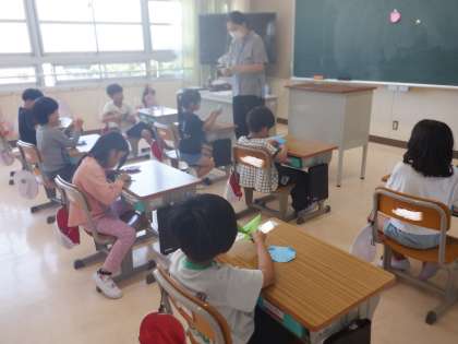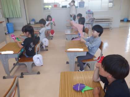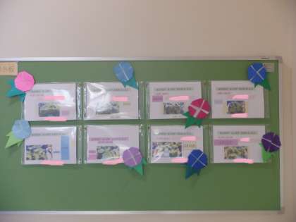 折り紙で、アサガオを作りました。花と葉っぱの部分を作って、重ねて貼りました。掲示板が華やかになりましたね。
