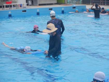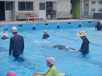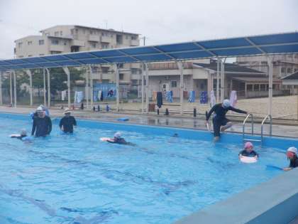 4・5・6年生 学校水泳4 公開日 2024/06/25 更新日 2024/06/25 学校紹介 ヘルパーをつけたり、ビート板を使ったりして、バタ足で進む練習をしました。足を曲げないように意識すると、ずいぶんと進むようになった人もいました。
