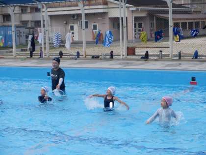 頭、背中としっかり水を体にかけて、入水しました。はじめに堺っ子体操をしました。水をバシャバシャさせました。