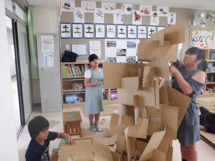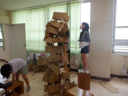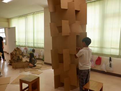 切り込みを組み合わせて、深く重ねていきました。身長を超え、いすに乗るほど高く重ねていきました。