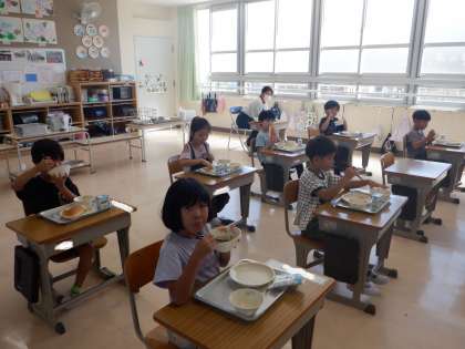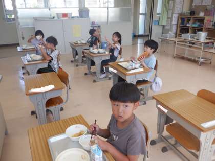 今日の給食は、コッペパン、チャンポン麺、シューマイ、牛乳でした。時間を意識して、しっかり食べていました。