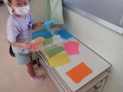 「光サンドイッチ」をテーマに、ペットボトルにいろいろな色の薄紙を入れて、光に透かしてみる飾りを作りました。