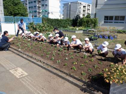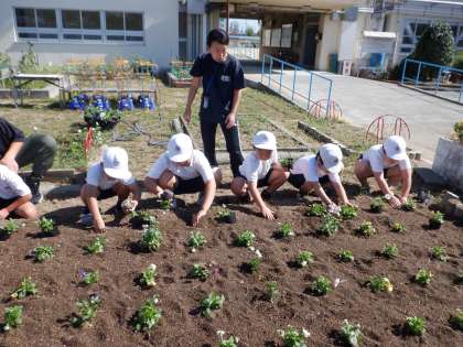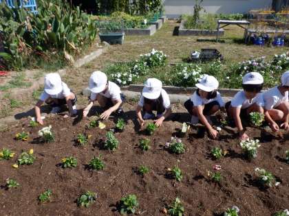 正門を入ってすぐの花壇に、パンジーの苗を植えました。ポットからそおっと出して、優しく植えました。
