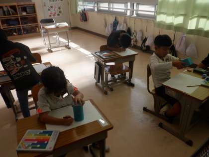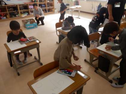 いろいろな箱から形を写し取って、絵を描きました。「〇はどの箱を使うといいかな」と使いたい形から、箱を選んでいました。