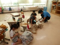 「ギュッとしたいわたしのお友だち」づくりをしました。新聞紙を中に入れたり,顔のパ...