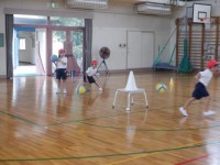 ボールをついたり,ドリブルしたりして,ボールとなかよくなる動きで遊びました。