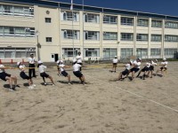 連合運動会の綱引きの練習です。縄の長さの関係で、各チーム、順番に引く人を交代して...