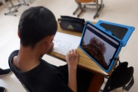 タブレットの画面に映し出した画像を熱心に模写しています。なかなかの画力ですよ!