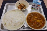 今日の献立は,ポークカレーライス,まめとひじきのサラダ,ごはん,牛乳です。