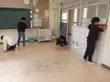 始めに教室以外の分担場所のトイレ掃除をしました。それから教室の机を全部出して、床...
