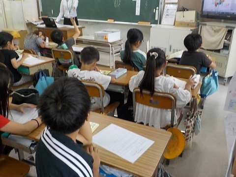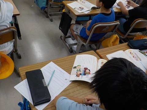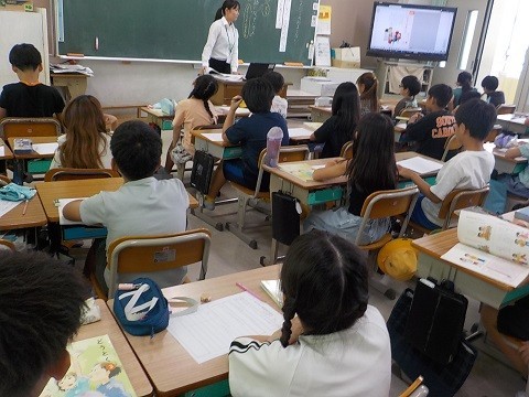 「とくジーのおまじない」というお話から、感謝することについて考えました。教育実習の先生が授業を行っていました。