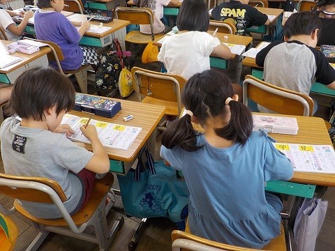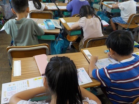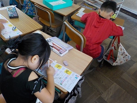漢字の学習です。言葉を発表した後に、ドリルにていねいに練習していました。