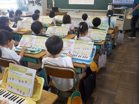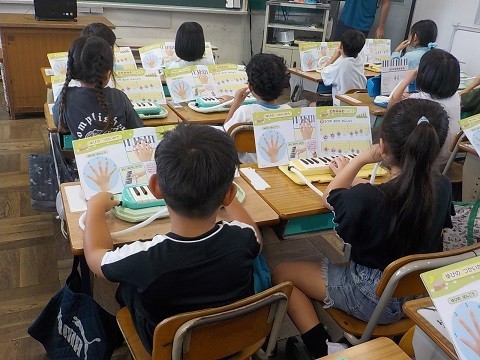 鍵盤ハーモニカで、5つの音の練習を行っていました。デジタル教材の音に合わせて、練習していました。