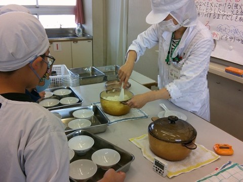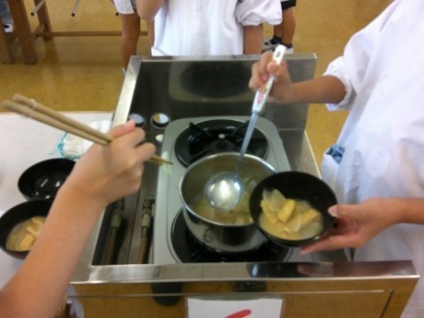調理実習で味噌汁を作りました。ご飯は鍋を使った炊き方で、こどもたちも興味津々でした。家庭でも味噌汁作りに挑戦してほしいです。