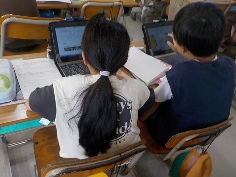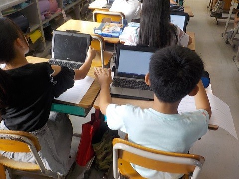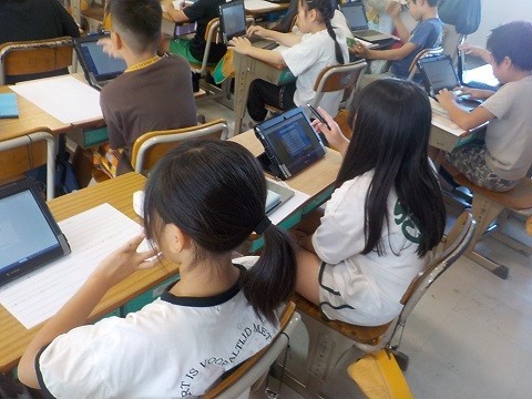 お仕事について調べています。タブレット等を使って調べたことを、ワークシートにまとめています。