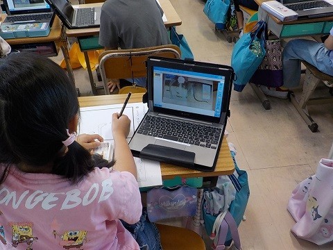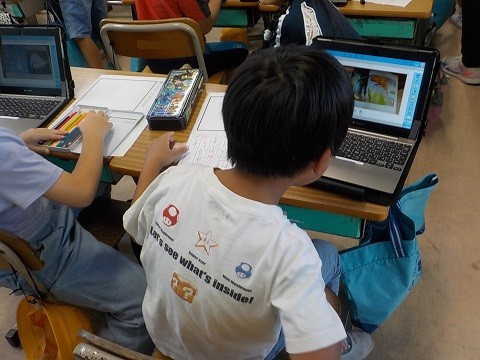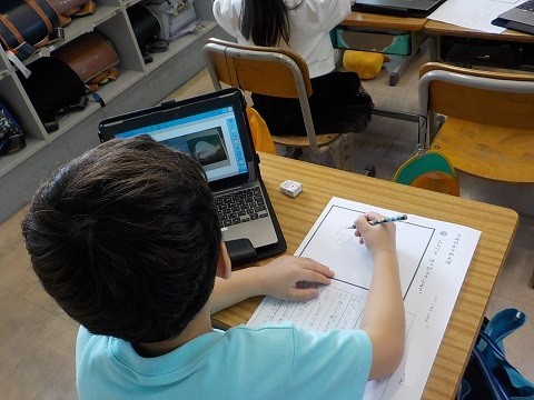 「うみのかくれんぼ」の学習です。タブレットに配付された資料をみて、ワークシートにまとめていました。