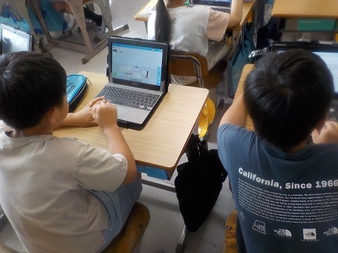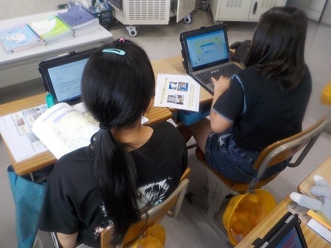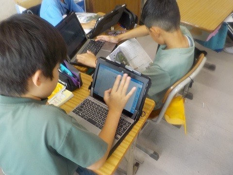 大阪府について調べています。大阪城や仁徳天皇陵等について、タブレットで調べ、まとめていました。