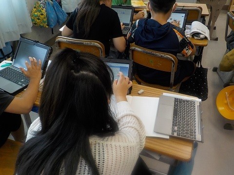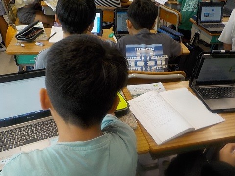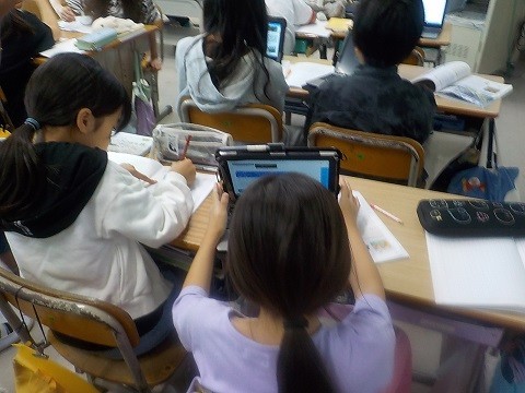 大阪府の学習を行っています。タブレットで大仙古墳について調べ、ワークシートにまとめていました。
