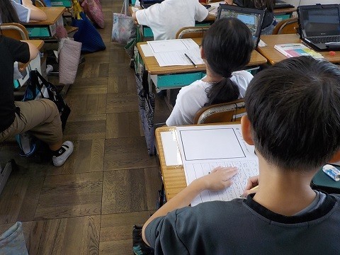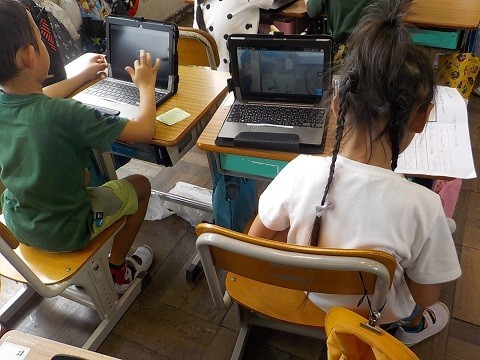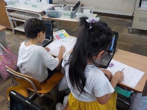 「うみのかくれんぼ」の学習で、タブレットを使い調べたことを、ワークシートにまとめていました。