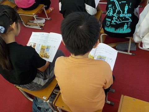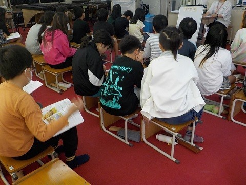 「ごんぎつね」の曲を聞いていました。メロディーを聞き、どのような感じがしたのかを交流していました。