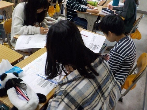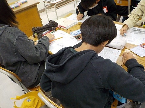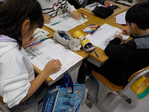 「鳥獣戯画を読む」の学習です。グループで文章を読み、筆者が工夫したことを見つけていました。