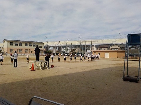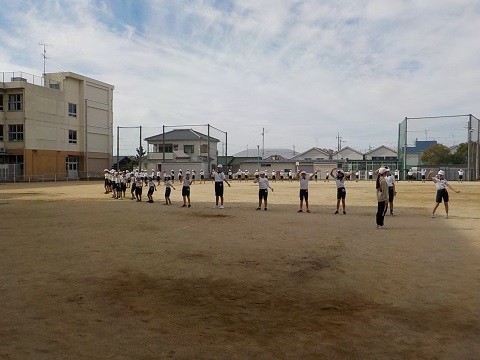 体育参観に向けての練習です。運動場で、団体演技の隊形移動の練習を行っていました。