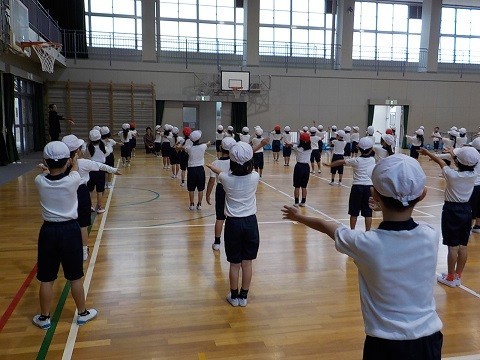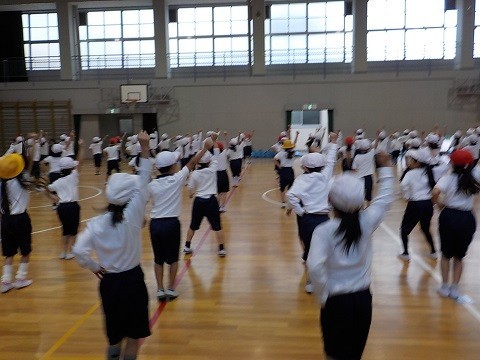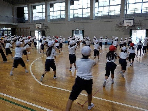 体育参観に向けての練習です。体育館で、団体演技の練習です。声をそろえてがんばっていました。