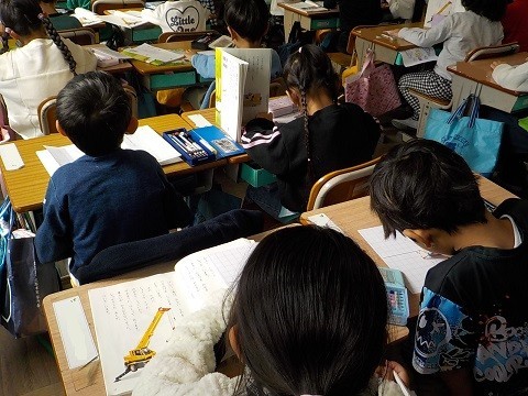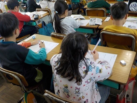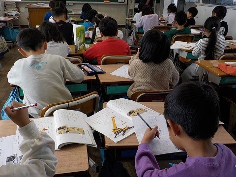 「自動車くらべ」の学習です。教科書から、自動車の特徴を読み取り、ワークシートに記入していました。