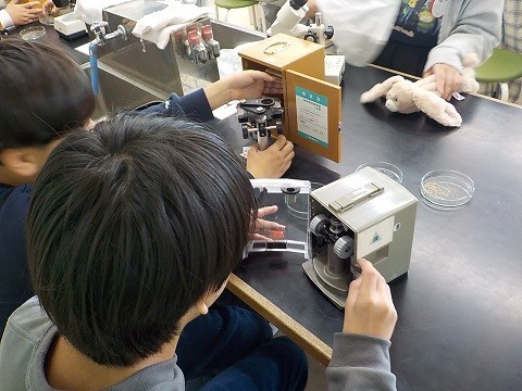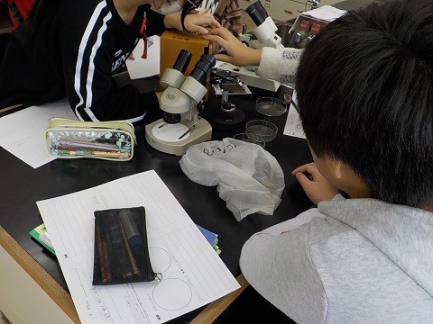 顕微鏡を使って、火山灰の観察を行っていました。