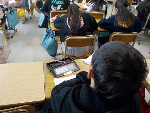 分数の学習です。わり算の商を分数で表す問題や、分数をわり算の式にする問題を行っていました。
