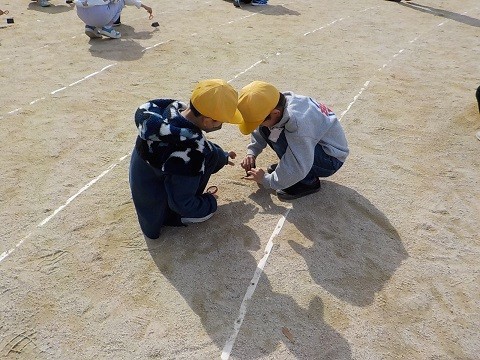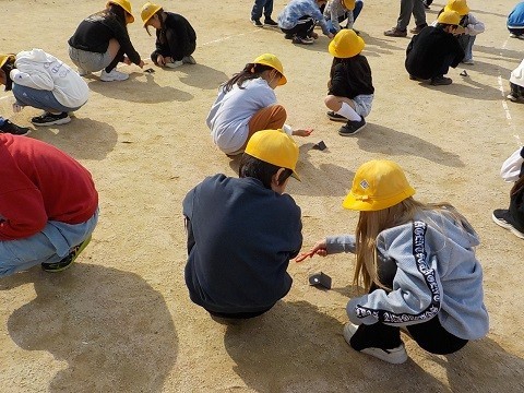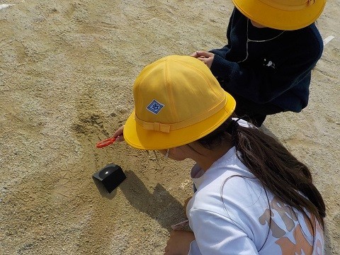 太陽とかげの学習です。運動場で、太陽の光を集めるとどのようになるのかを調べる実験を行っていました。
