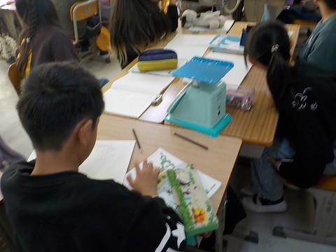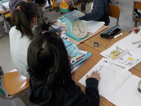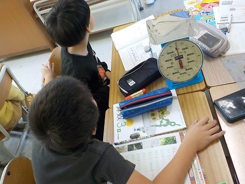 重さの学習です。はかりを使い、いろいろなものの重さを量っていました。1めもりがどれぐらいの重さなのかを考えていました。
