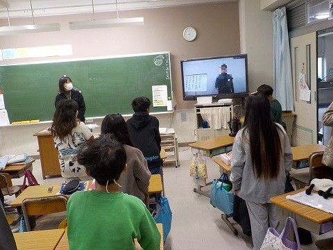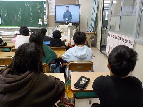テレビ朝礼の様子です。まずは元気よく校歌を歌いました。生徒指導の先生からは、学校での生活についてのお話がありました。