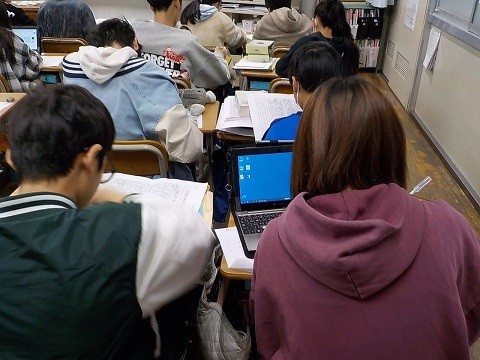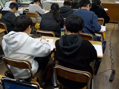 卒業文集に向けての取り組みです。タブレットで下書きを行っている人、原稿用紙に書きはじめている人がいました。