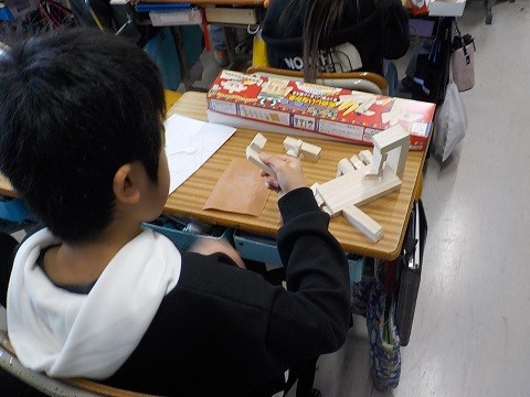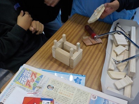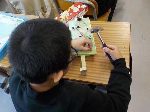 「ギコギココロコロ」です。糸のこで木材を切ったり、くぎを使ったりして、制作を行っていました。