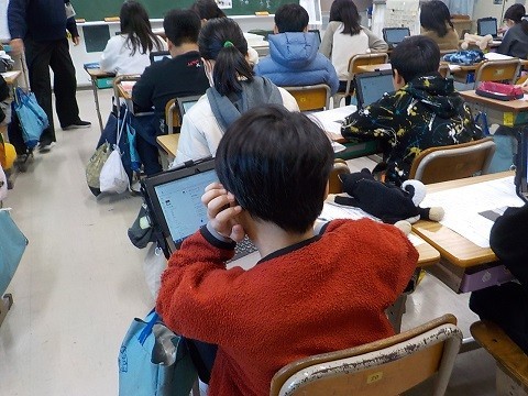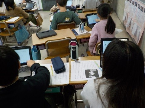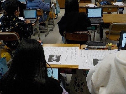 「大造じいさんとガン」です。残雪とのたたかいをどのように語っているのかを考え、タブレットを使って交流していました。