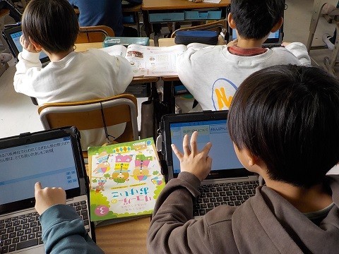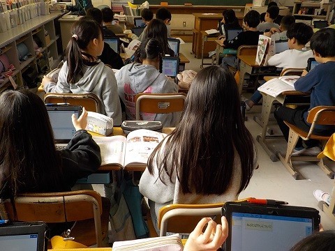 音楽です。地域に伝わる祭りばやしについて、タブレットで調べていました。